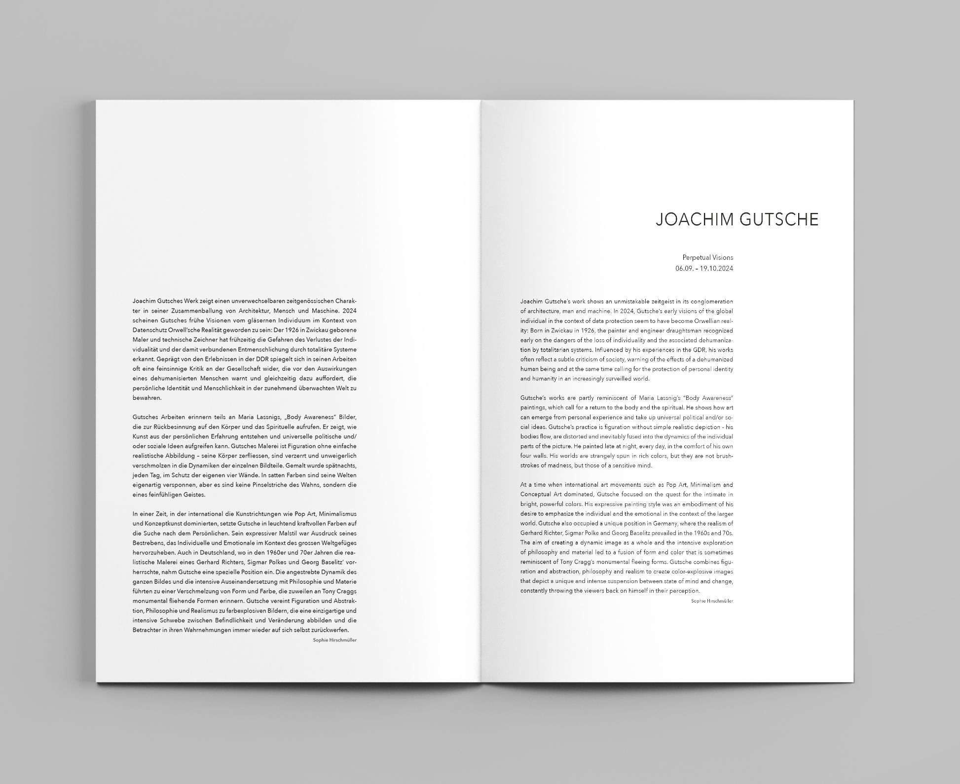 The exhibition Joachim Gutsche at Galerie Haas in Zurich highlighted the artist’s expressive abstract works. Our main task was the conception and design of the exhibition catalogue, complemented by PR, signage, and e-commerce. The catalogue translated Gutsche’s artistic language into a carefully curated publication that extended the exhibition experience in the gallery.